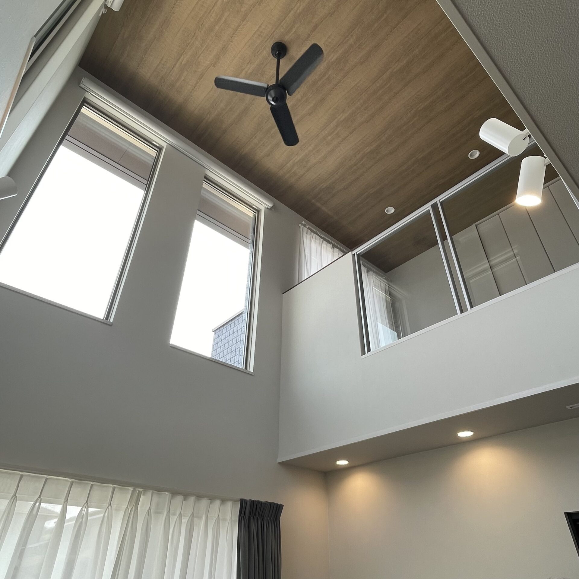 大きな吹き抜けと高窓を取り入れ、1,2階が繋がる、心地いい空間が広がります。